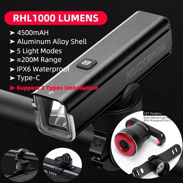 Rockbros RHL-1000 Lumens Q5 Smart Tail Light Ensemble de feux avant et arrière Head Rear Light Bundle
